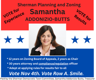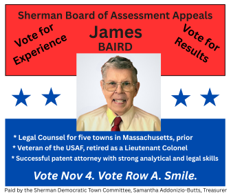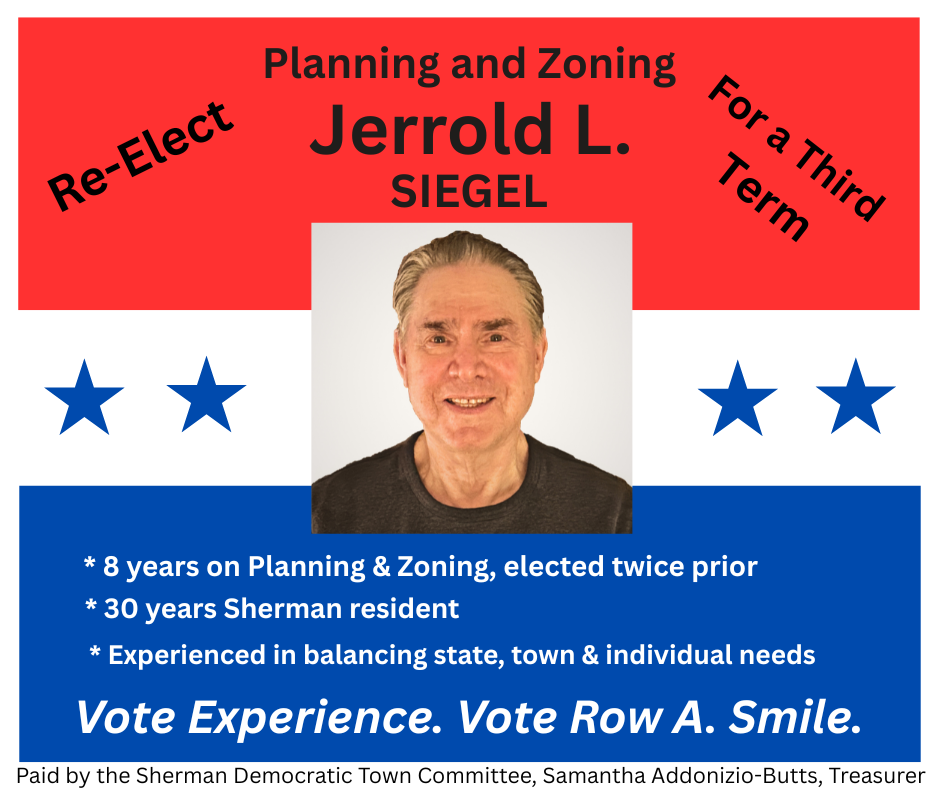 As a twenty-three-year resident, my passion is for making Sherman a better place to live, work, and play. Folks in town know me as one who cares deeply about our town’s quality of life. I am well qualified in temperament, motivation, and experience to work with town officials, staff, and citizens to achieve our common goals and address our challenges.